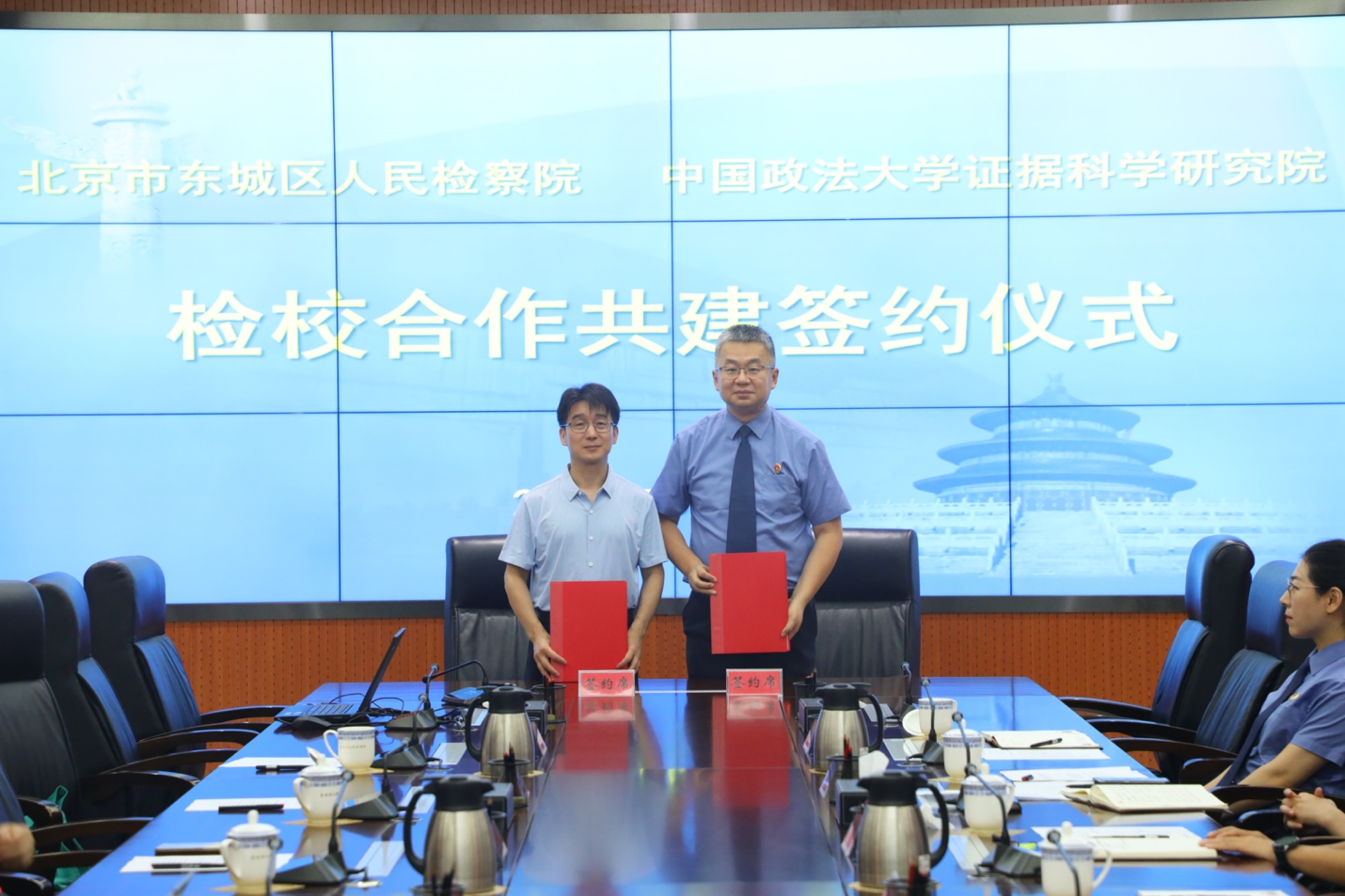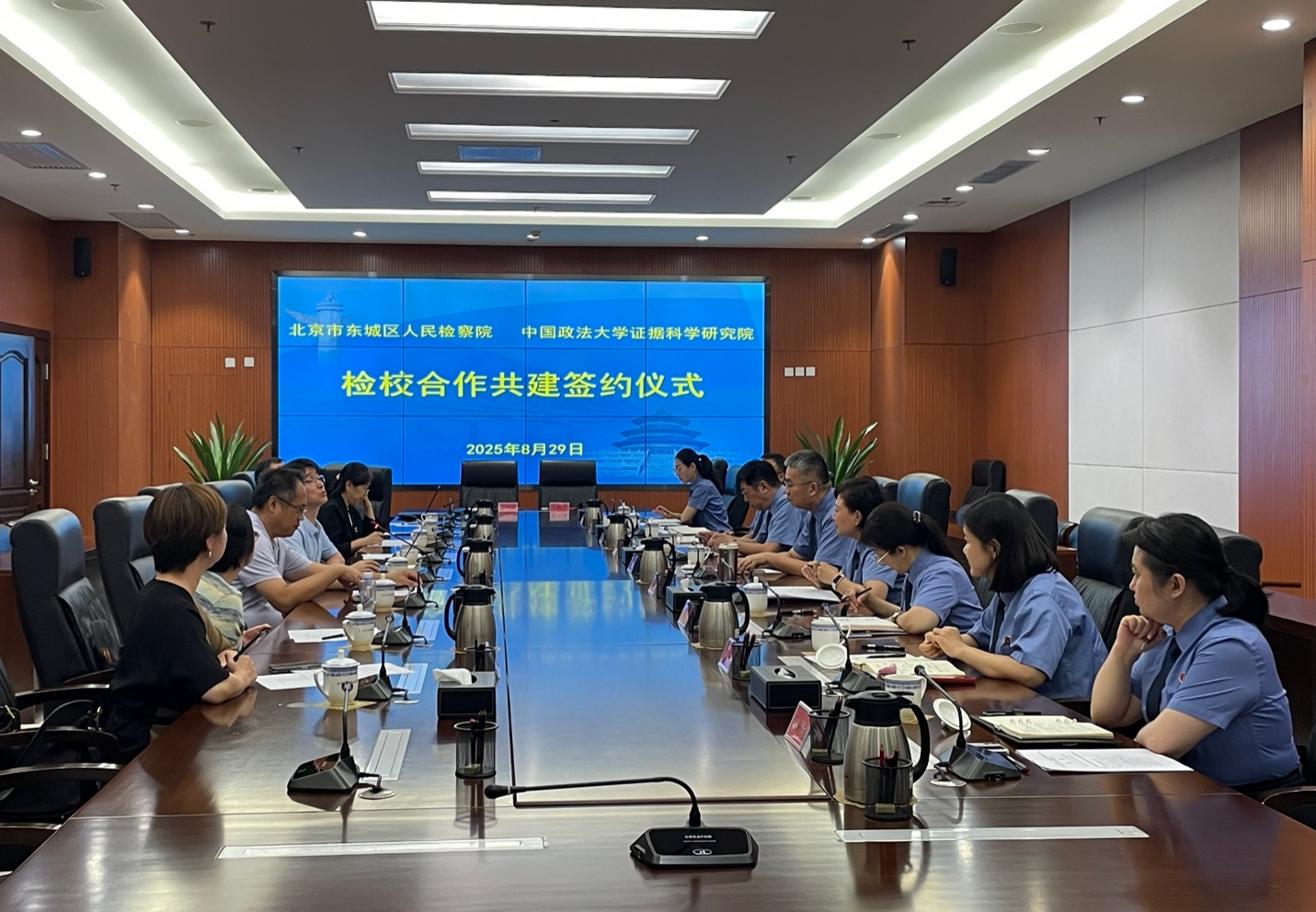 2025年8月29日,证据科学研究院与北京市东城区人民检察院成功举行检校合作共建协议会签仪式。证据科学研究院院长彭文华、副院长张中、副院长赵东、院党委副书记杨俊丽、院办主任杨俊青、院长助理褚福民、院长助理王元凤、院外事助理曹晶,以及东城区检察院党组书记、检察长李华伟,党组副书记、副检察长赵文胜,党组成员、副检察长张仁杰,副检察长(挂职)付荣,检委会专职委员朱海燕,政治部副主任严明英及各部门负责人出席了签约仪式。