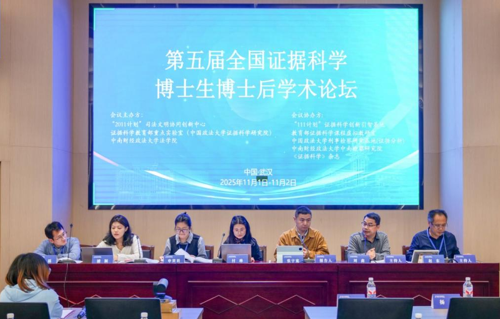 2025年11月1日至2日,第五届全国证据科学博士生博士后学术论坛在武汉举行。本届论坛由“2011计划”司法文明协同创新中心、中国政法大学证据科学研究院、中南财经政法大学法学院主办,“111计划”证据科学创新引智基地、教育部证据科学课程虚拟教研室、中国政法大学刑事检察研究基地(证据分析)、中南财经政法大学中南检察研究院、《证据科学》杂志协办。来自清华大学、北京大学、中国人民大学、南京大学、武汉大学、山东大学、四川大学、重庆大学、吉林大学、西南政法大学、华东政法大学、北京外国语大学、江西财经大学、中国政法大学、中南财经政法大学等高校的二十余位博士生、博士后以及来自全国各高校的十余位专家学者参加本届论坛。