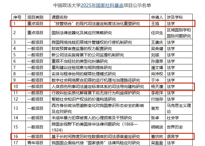 在 25-09-08 19:31:43 提交 浏览 次 近日,全国哲学社会科学工作办公室正式公布2025年度国家社科基金立项名单,中国政法大学证据科学研究院教授团队喜获三项立项,包括重点项目1项,一般项目2项,展现出我院文理交叉研究领域的实力与优势。 具体来讲,王旭教授领衔的《“技管结合”的现代司法鉴定制度法治化重塑研究》获重点项目立项,杨天潼副教授领衔的《人体损伤刑事司法鉴定标准体系的司法导向构建研究》、曹洪林副教授领衔的《基于长时间跨度历时性数据库的司法语音鉴定研究》获一般项目立项。